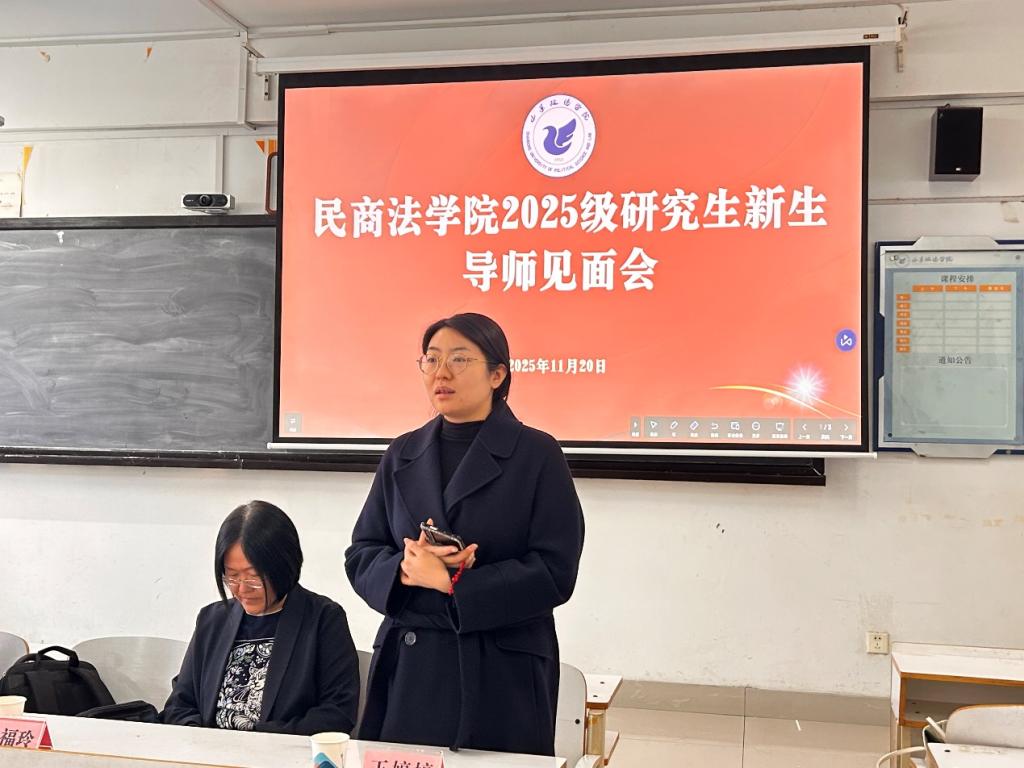 见面会结束后,研究生学术沙龙同步开展。活动由2025级非法学1班董鹏宇主持,2024级非法学2班孟婷婷同学以《法律价值实现的多元动力:社会舆论驱动与人文关怀滋养的法理逻辑探究》为题进行汇报。该论文曾荣获2025年山政“五四论文”评选二等奖,汇报中,孟婷婷从研究背景、核心观点、论证逻辑等方面展开阐述,展现了扎实的学术基础与严谨的思辨能力。