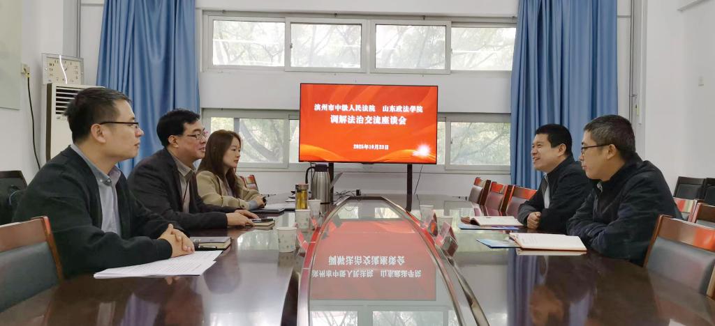 10月23日,山东省滨州市中级人民法院法律政策研究室主任刘连义、法官张猛猛一行莅临民商法学院,就调解法治工作开展座谈交流。民商法学院院长陈志刚,副院长、调解法治教研室主任张乾及张琪博士参加座谈。
