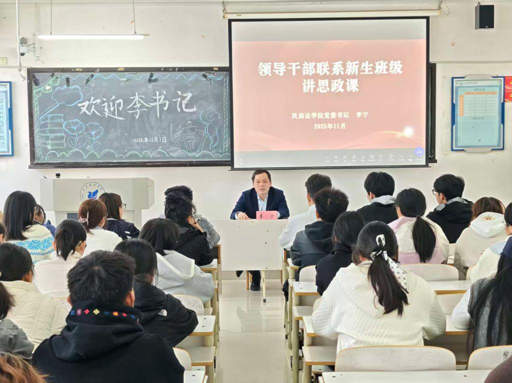 为扎实落实立德树人根本任务,深入贯彻领导干部联系新生班级工作制度,进一步加强学生思想政治教育工作,近期,学校及学院多位领导干部走进民商法学院2025级新生班级,通过讲授思政课、开展主题座谈等多种形式,引导学生坚定理想信念、明确发展方向、夯实成长根基。