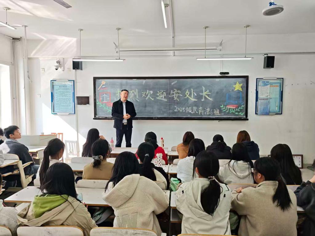 10月29日,学生工作处处长安军走进所联系的民商法学院2025级法学6班,以“珍惜大学时光,不负青春年华”为主题与同学们亲切交流,并提出三点期望:一是立德修身,勇担使命,胸怀“国之大者”,涵养优良品格;二是勤学笃行,提升本领,坚持学以致用,强化专业学习;三是全面发展,健康成长,加强体育锻炼,注重人际沟通。