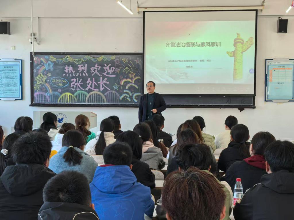 11月10日,发展规划处处长张建波为2025级知识产权2班学生开展“齐鲁法治楹联与家风家训”主题讲座。他以楹联为载体,通过“正义萦胸,法如磐石”“公平在手,心似镜湖”等原创楹联,深入解读中华优秀传统法律文化,引导学生在法治精神与家风传承中筑牢价值根基。