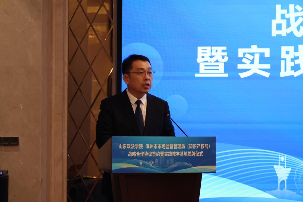 仪式上,王效彤对滨州市人民政府、滨州市市场监督管理局(知识产权局)长期以来对学校事业发展给与的支持表示感谢,并就学校基本情况、发展历程、人才培养等进行了详细介绍。他指出,山东政法学院学科、人才优势突出,合作资源丰富,已与多地多部门建立合作关系。此次与滨州市市场监管局合作,是深入学习贯彻习近平法治思想,全面落实两办意见的重要举措,学校将整合资源,围绕滨州新兴产业法治保障、法治滨州建设、涉外法治服务、黄河战略法治保障等多领域深化合作,输送优质法律人才,提供智力支持,实现校地共赢,助力滨州高质量发展与法治山东建设。