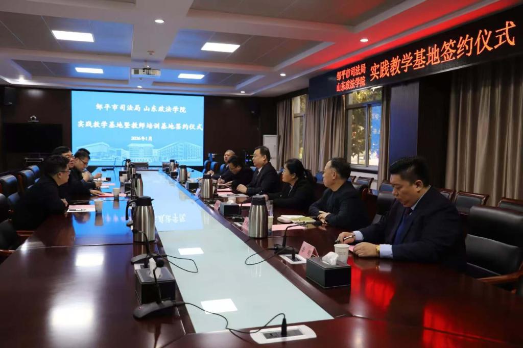 2026年1月28日下午,邹平市司法局党组书记、局长王平一行5人赴山东政法学院开展实践教学基地签约活动。民商法学院院长陈志刚,副院长张乾、赵京朝,薛玉飞博士参加活动。