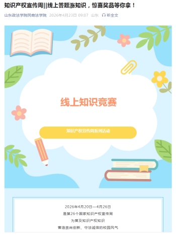 4月23日至26日,民商法学院面向全校师生举办知识产权线上知识竞赛。竞赛内容涵盖专利法、商标法、著作权法等核心法律法规及典型应用场景,引导同学们在比赛中检验专业功底、巩固知识体系。